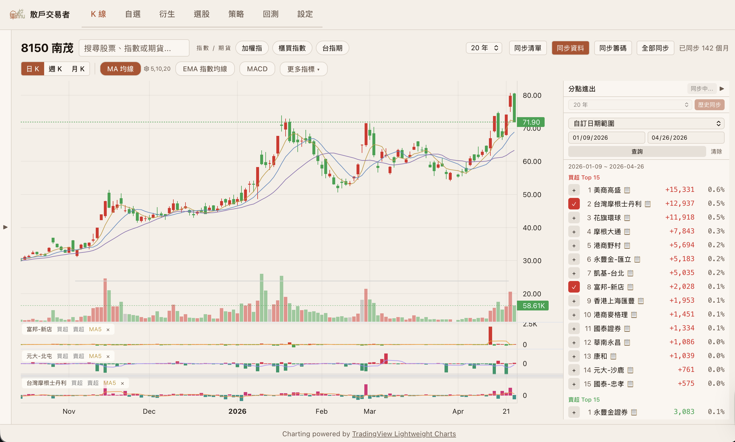 - 台灣摩根士丹利的分點柱狀圖:從截圖底部可以觀察到,台灣摩根士丹利的買超(紅色柱狀)在 3 月到 4 月期間明顯放大,MA5 持續向上——屬於「加速吸貨」而非隔日沖的短線操作。