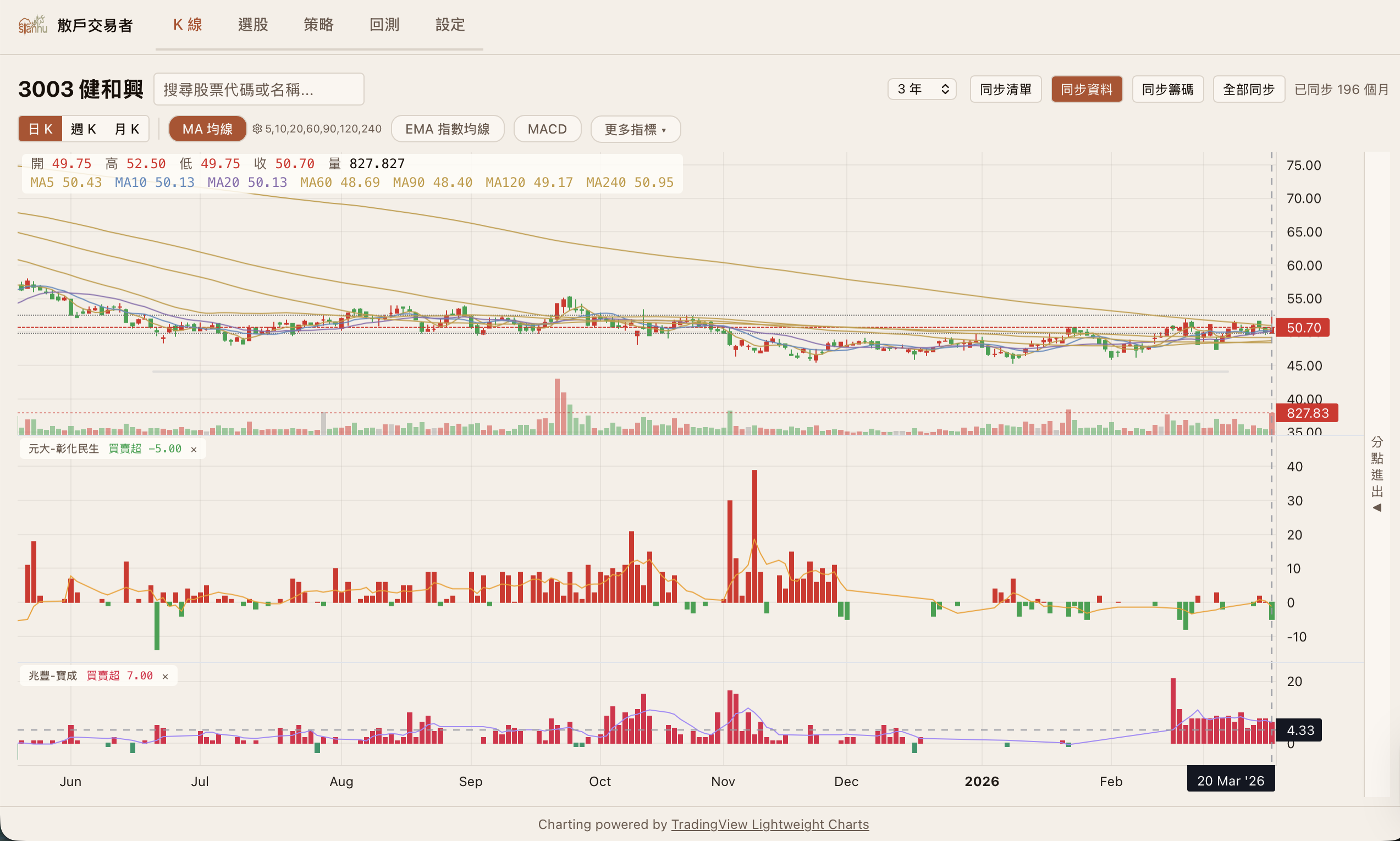 • 均線系統 (MA / EMA) 高度糾結:從短期的 MA5 (50.43)、MA10 (50.13)、MA20 (50.13) 到中線的 MA60 (48.69)、MA120 (49.17) 以及長線的 MA240 (50.95),所有短期均線與紫色的 EMA (指數移動平均線) 幾乎在 49 到 51 元的狹窄區間內完全重合糾結。且短中期均線皆已向上翻揚並形成多頭排列的雛形,展現極強的底部支撐。